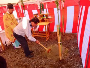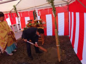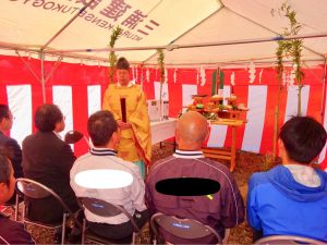 神主様が神様にお供え物を差し上げ、この土地を使うためのお許しと共に工事の安全祈願を行います。