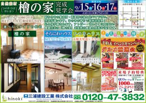 こんにちは。三浦建設工業の川田です。 9/15~9/17日開催の『檜の家』完成見学会に沢山のご来店、誠に有難うございました。 一 ......